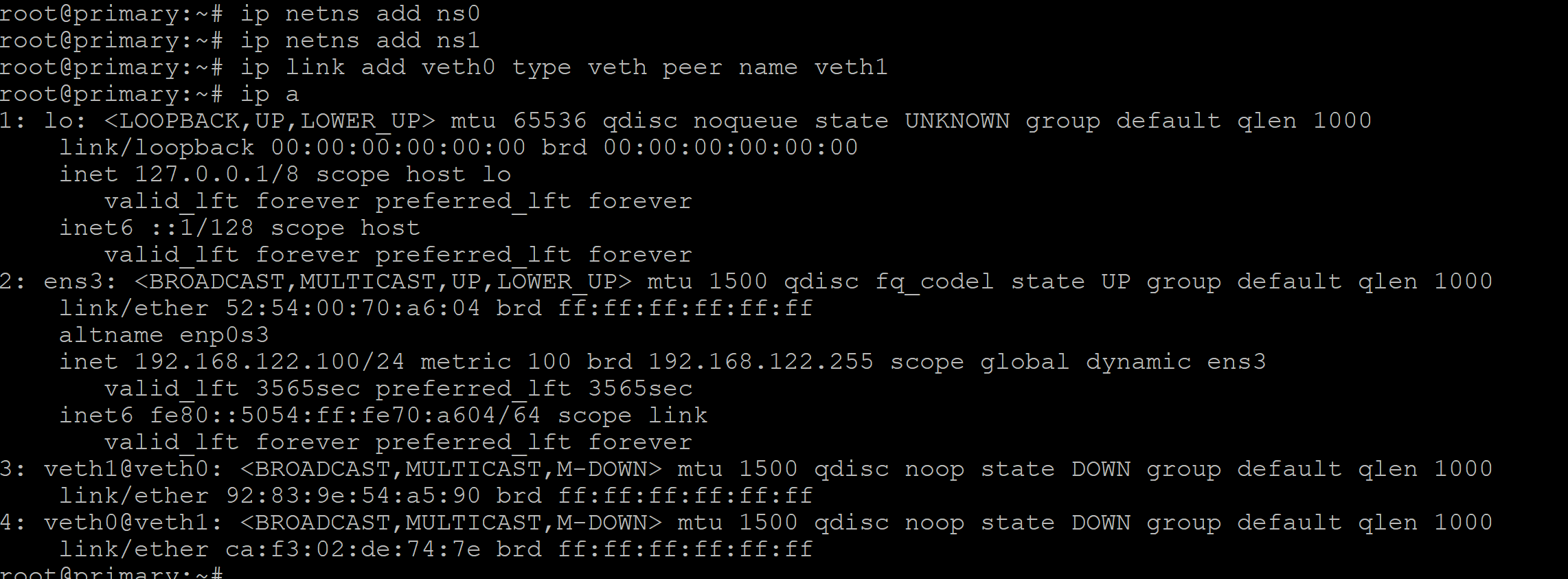 3: veth1@veth0: <BROADCAST,MULTICAST,M-DOWN> mtu 1500 qdisc noop state DOWN group default qlen 1000